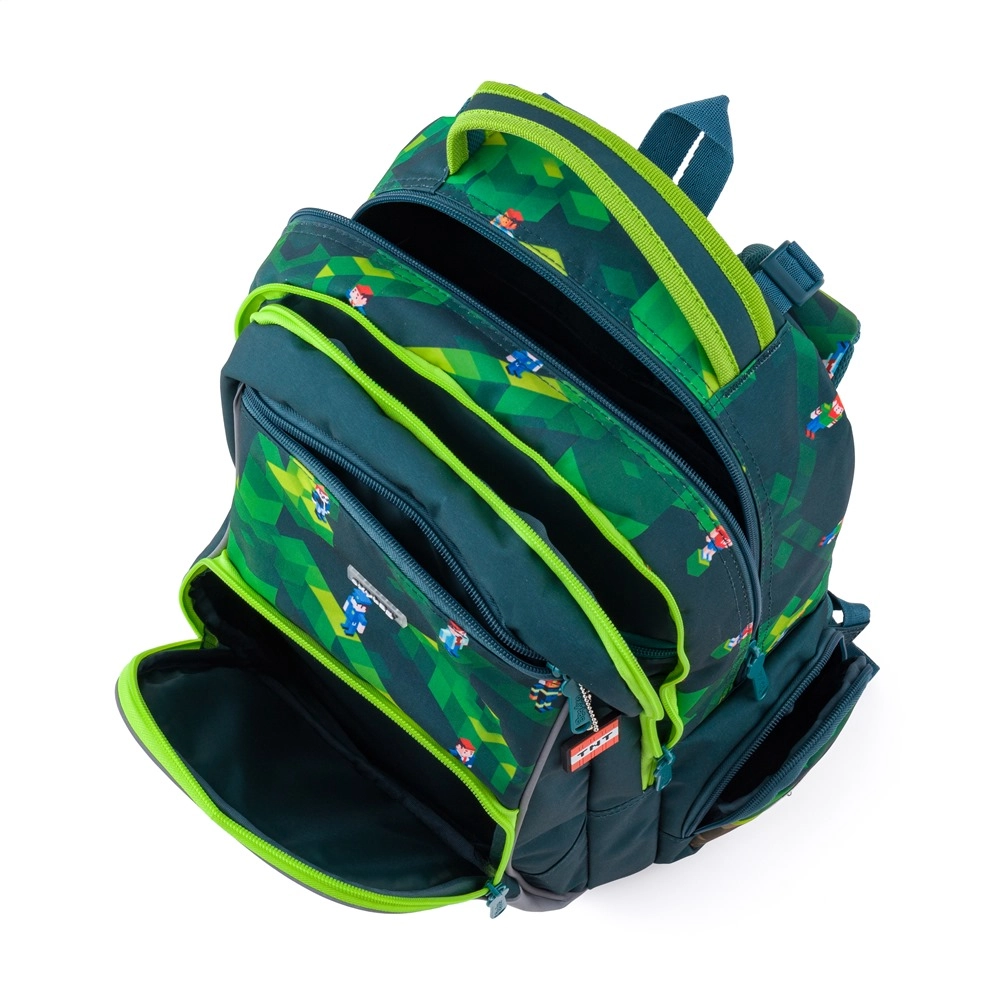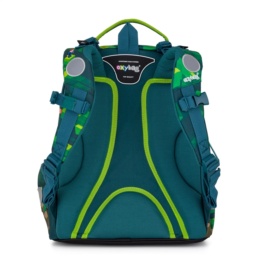 OXY GO Playworld è uno zaino scolastico ben progettato che combina comfort, sicurezza e design accattivante. Si adatta perfettamente alla schiena grazie al pannello dorsale anatomico e traspirante, lungo 39 cm. Gli spallacci regolabili sono dotati di gancetti aggiuntivi per fissare le estremità più lunghe, così da non intralciare durante la camminata.
