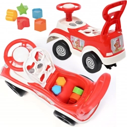La macchinina cavalcabile multifunzionale WOOPIE 4 in 1 è ideale per bambini dai 18 mesi. Il bambino può procedere spingendosi con i piedini, appoggiarsi allo schienale sagomato e allenare i primi passi, mentre il sortitore interattivo con forme colorate sviluppa la motricità fine e il pensiero logico. Il vano sotto il sedile contiene blocchi e piccoli tesori.