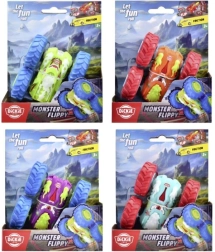 Grazie alla struttura bifacciale e alle ruote grandi, l’auto esegue flip, capriole e prosegue la corsa anche dopo il ribaltamento.