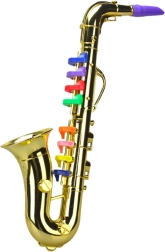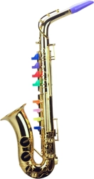 Il sassofono per bambini in elegante colore oro con chiavi colorate colpisce a prima vista e si impugna facilmente. La realizzazione meccanica senza batterie è sicura, ecologica e sempre pronta a suonare: basta soffiare e premere i tasti.