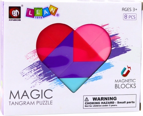 Scopri il divertimento con il tangram magnetico – cuore. Otto pezzi variopinti con magneti di qualità permettono di comporre decine di figure e sagome diverse. Grazie al fissaggio solido, i modelli sono stabili, facili da trasportare e i bambini possono giocare a lungo con gioia.