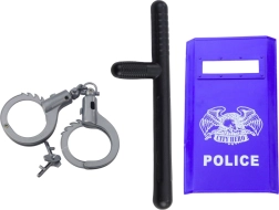 - Casco, manette con chiavi, pistola, binocolo, ricetrasmittente, manganello, distintivo, scudo protettivo