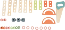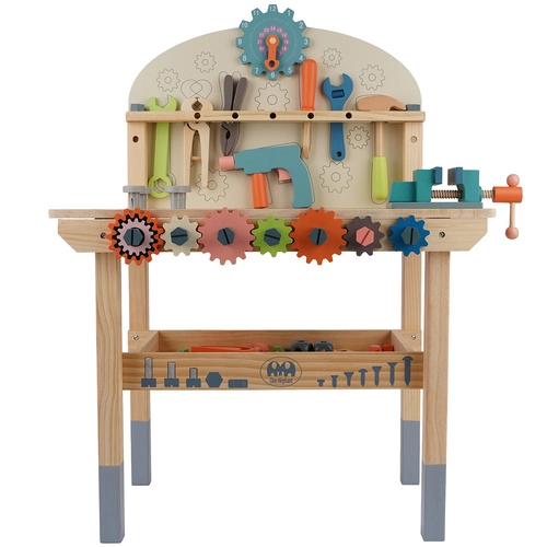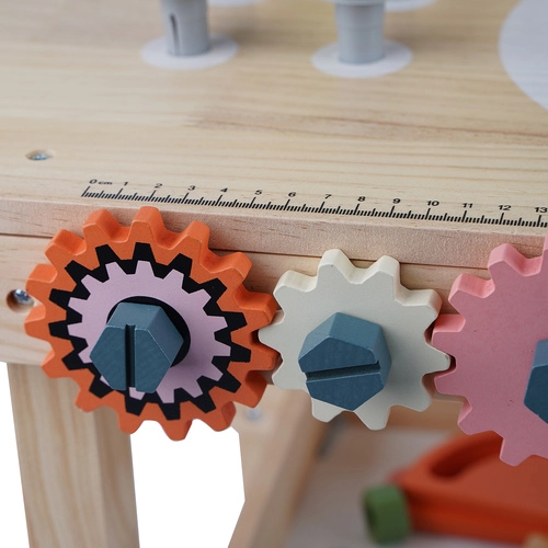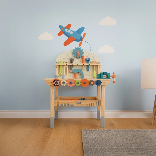 Il set include numerosi attrezzi e elementi di fissaggio che sviluppano motricità fine, coordinazione occhio‑mano e pensiero logico. La pratica mensola inferiore offre spazio per riporre componenti e accessori. Un regalo perfetto che farà felice ogni piccolo artigiano.