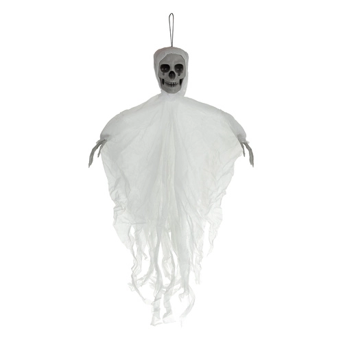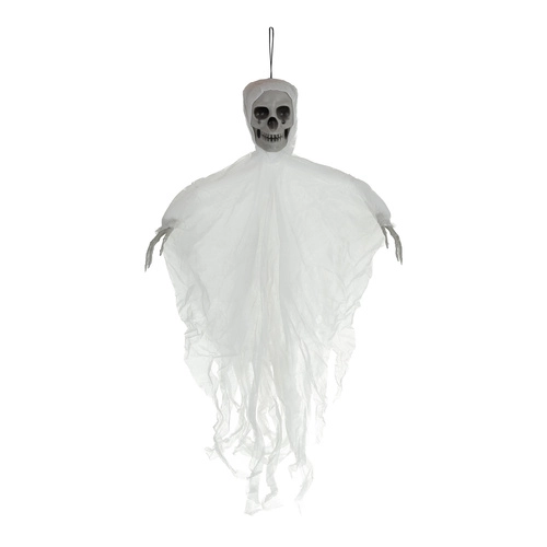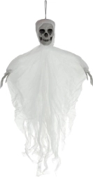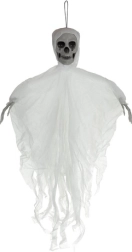 Realistico scheletro sospeso con teschio e tessuto strappato che crea subito un'atmosfera spettrale. Struttura leggera e occhiello per l'appensione per un facile posizionamento su soffitto, porta o lampadario, ma anche in spazi esterni coperti. Il tessuto in movimento crea l'effetto di un'apparizione fluttuante e le dimensioni maggiori di 70 cm garantiscono che diventi il centro dell'attenzione. Perfetto per Halloween, feste a tema e scenografia.