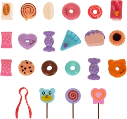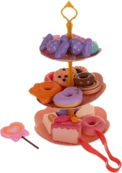Contenuto della confezione: valigetta con manico e chiusura in metallo, alzata a tre piani per dolci, teiera con coperchio, 4 tazze, 4 piattini, 4 cucchiaini decorativi, pinzette, vassoio da portata, 21 dolcetti (caramelle, ciambelle, macaron, biscotti), manuale d’uso, scatola da trasporto marrone.