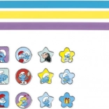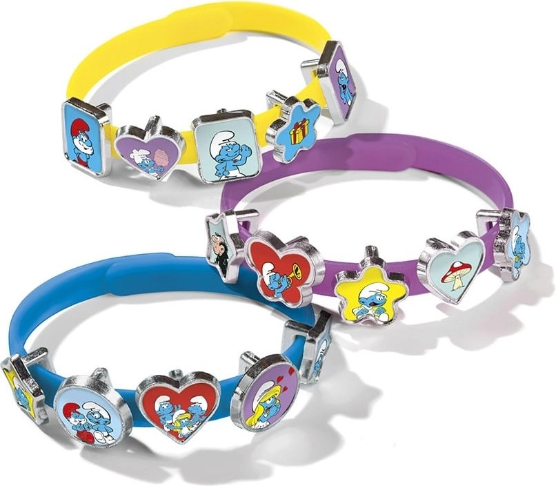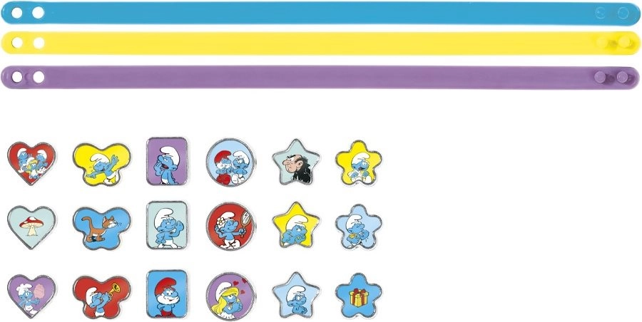 - 3 braccialetti (giallo, viola, blu), 18 perline con motivi dei Puffi