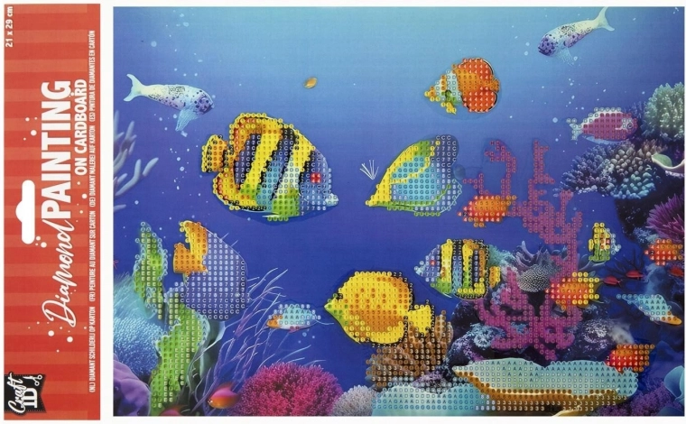 La pittura diamantata è il modo perfetto per trascorrere il tempo libero creando un’opera d’effetto. Il motivo dei pesciolini, in formato 29 × 21 cm, piacerà a bambini e adulti. Con la penna applicatrice trasferirete facilmente le pietrine nei punti contrassegnati, componendo passo dopo passo un mosaico scintillante.