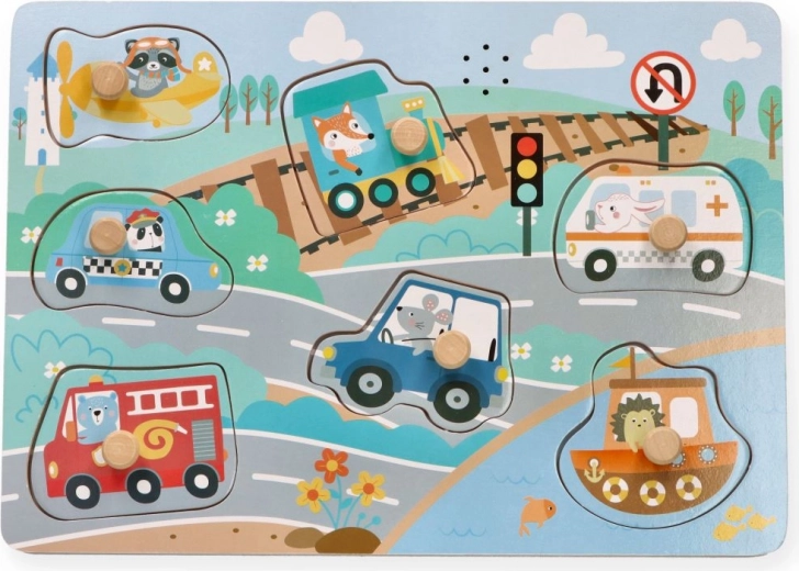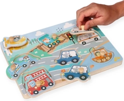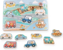Scopri divertenti puzzle sonori a tema veicoli per i più piccoli. Quando ogni pezzo è inserito correttamente, riproduce il corrispondente suono del veicolo, favorendo lo sviluppo della motricità fine, la comprensione di causa ed effetto e la stimolazione uditiva. Giocattolo didattico ideale per bambini a partire da 12 mesi.