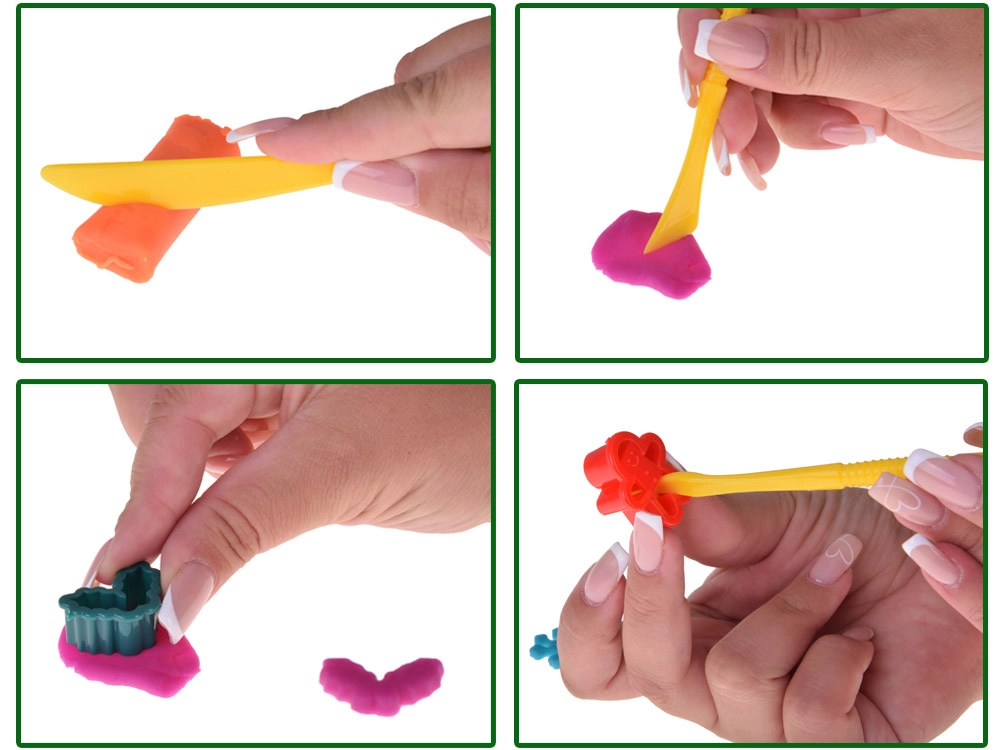 - 6 colori vivaci di pasta da modellare: verde, blu, rosso, viola, giallo, arancione