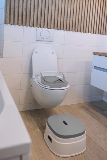 Include una vaschetta interna estraibile per una pulizia semplice e rapida, un riduttore WC rimovibile per l’uso sui WC standard e uno sgabello pratico con impugnature laterali che aiuta il bambino a raggiungere il lavandino o superfici più alte.