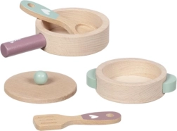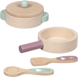 Questo set da cucina in legno farà felici tutti i piccoli chef. La padella e la pentola con coperchio sono realizzate in resistente legno di faggio, adatto anche ai “piccoli esperimenti culinari” quotidiani. Grazie alla lavorazione solida e ai bordi levigati, il gioco è sicuro e piacevole al tatto.
