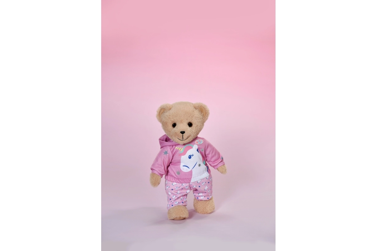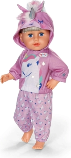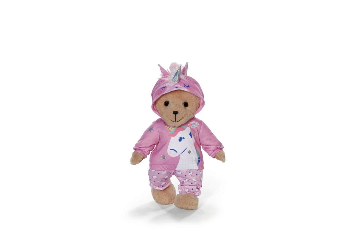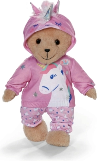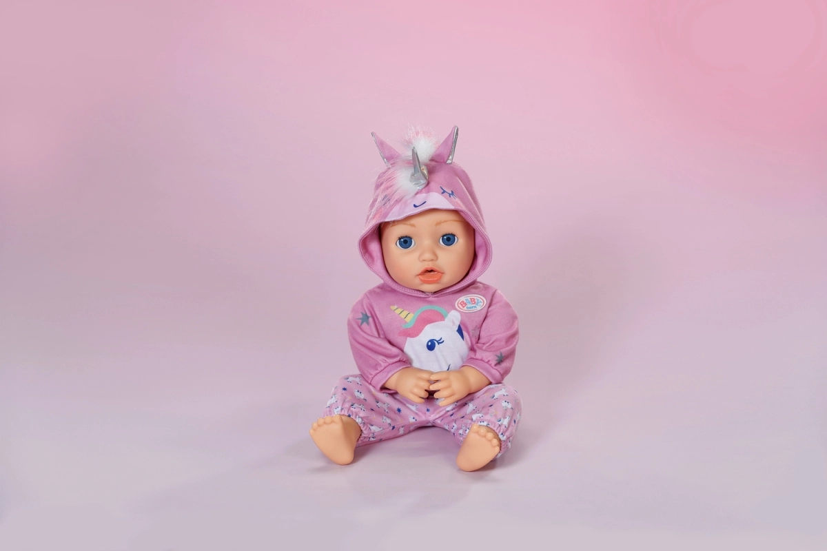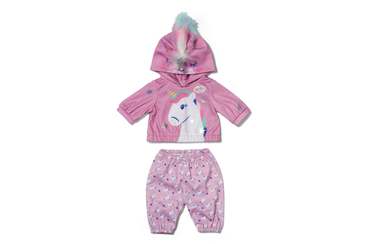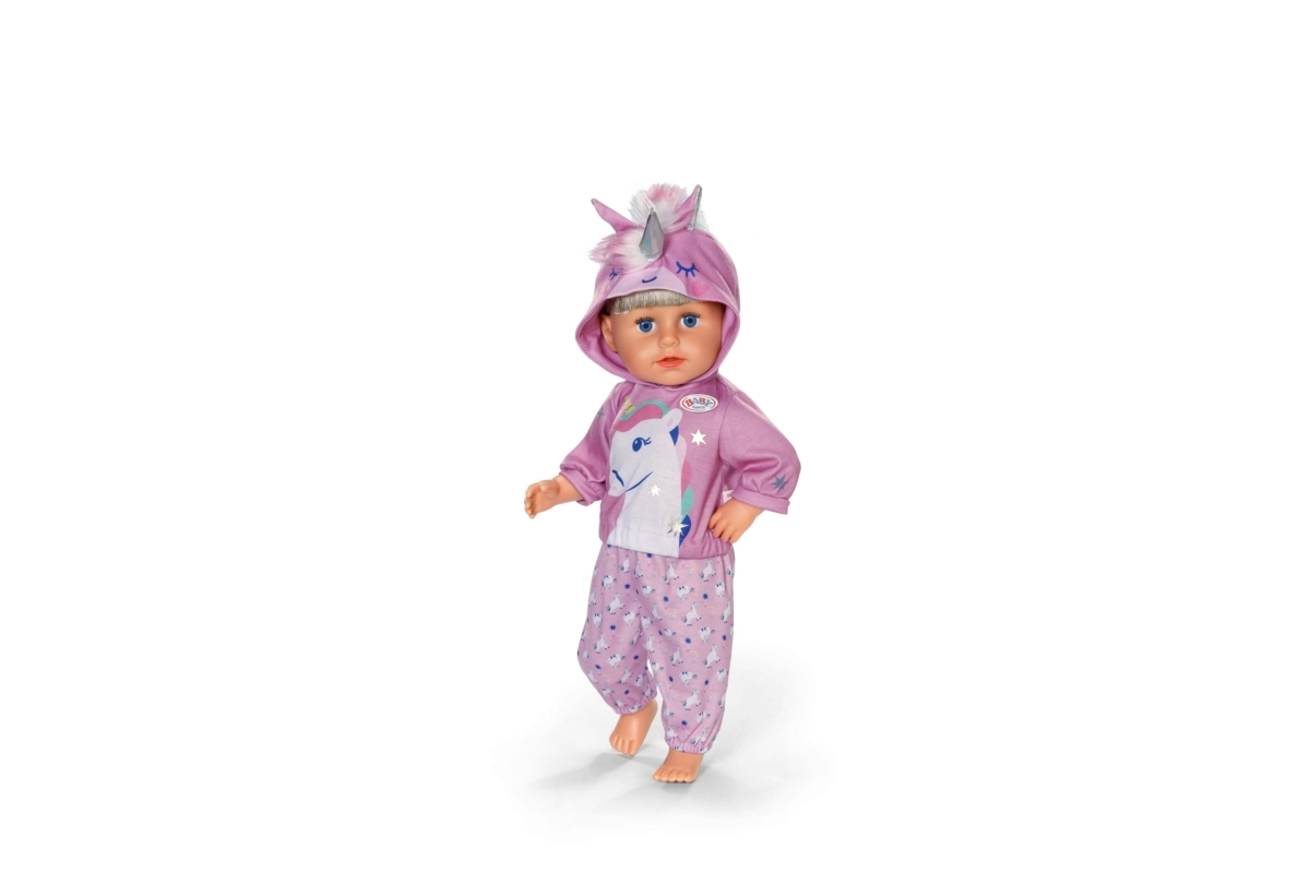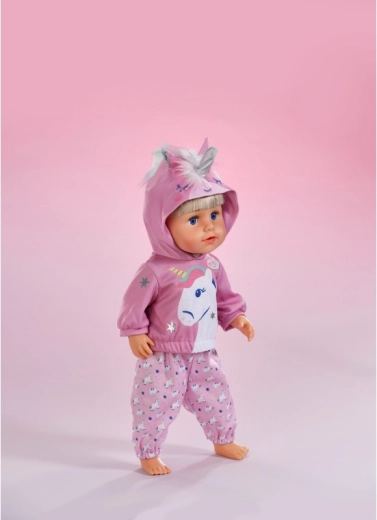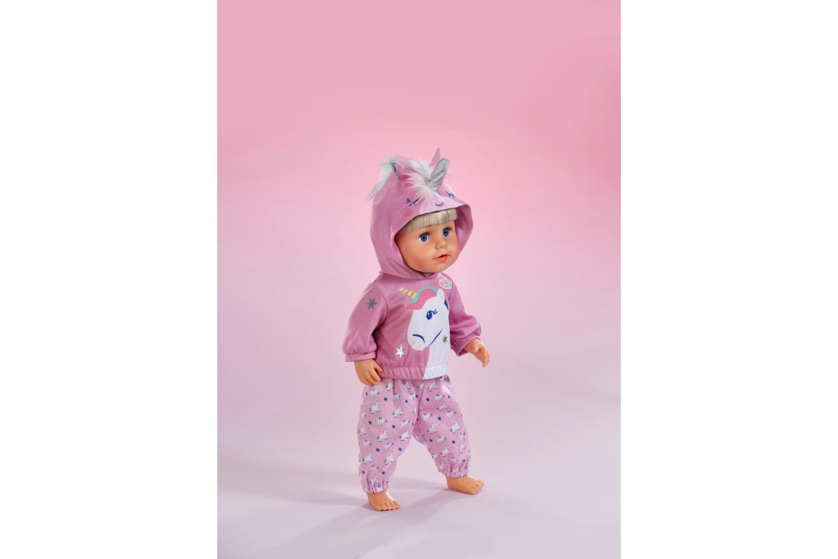 Un elegante outfit da unicorno trasforma ogni bambola in un’amica da fiaba. La morbida felpa con cappuccio dotato di corno e orecchiette e i pantaloni coordinati con fantasia di unicorni incoraggiano il gioco creativo, il racconto di storie e lo sviluppo della motricità fine grazie al cambio semplice dei vestiti.