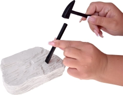 Trasforma il tavolo in un piccolo sito archeologico. In ogni blocco è nascosta una fossile di teschio selezionata casualmente – può essere un mammut, una tigre dai denti a sciabola, un coccodrillo, un rinoceronte lanoso, un bufalo africano, un’aquila, una pecora con lunghe corna o persino un uomo-scimmia. Grazie a scalpelli, martelletto e pennellino i bambini rivelano passo dopo passo le singole parti, le puliscono e ottengono un modello unico.