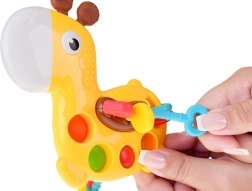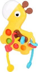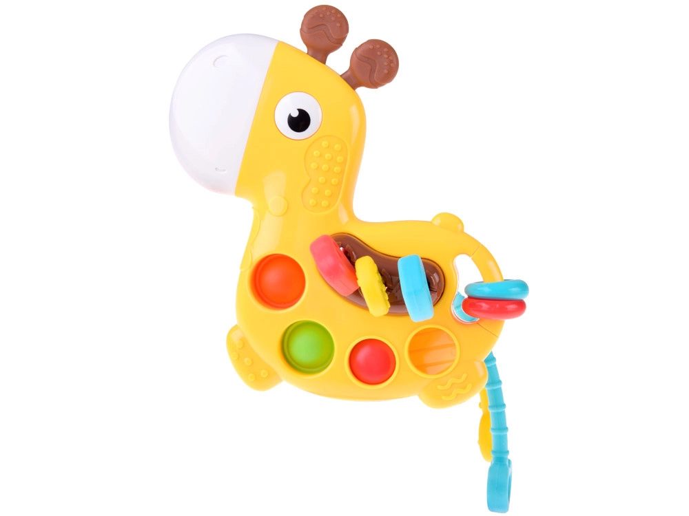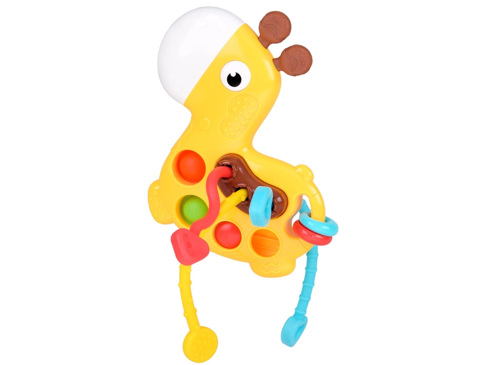La mini giraffa offre un ricco stimolo sensoriale: il bambino può premere le bolle pop it, far scorrere le perline oppure tirare le morbide appendici attraverso il corpo della giraffa. Il materiale morbido e sicuro massaggia delicatamente le gengive e aiuta durante la dentizione, mentre gli effetti visivi e sonori sostengono la concentrazione e la curiosità.