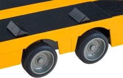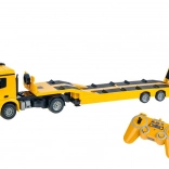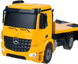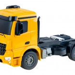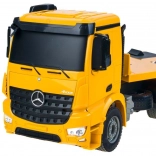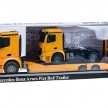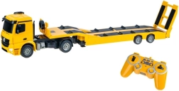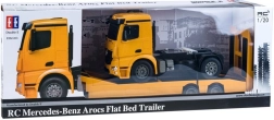Trattore MERCEDES-BENZ con semirimorchio pianale con licenza per il trasporto di macchine edili, offre suoni realistici del motore, effetti luminosi e controllo completo su frequenza 2,4 GHz. Grazie agli pneumatici in gomma e alla regolazione della convergenza delle ruote, la guida è fluida e precisa. Il semirimorchio dispone di una rampa sollevabile e supporti regolabili e può essere collegato/scollegato elettronicamente tramite il telecomando.