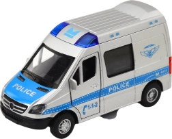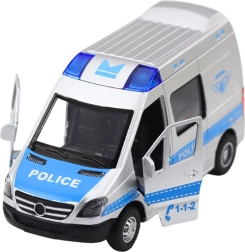 Modello di auto della polizia realistico in scala 1:32 in metallo e plastica di qualità che farà felice ogni piccolo tutore della legge. Offre meccanismo pull back, porte apribili e attraenti effetti luminosi e sonori. La costruzione robusta e la finitura argento con scritte “POLICE” garantiscono resistenza e un ottimo aspetto sia nel gioco sia in collezione.