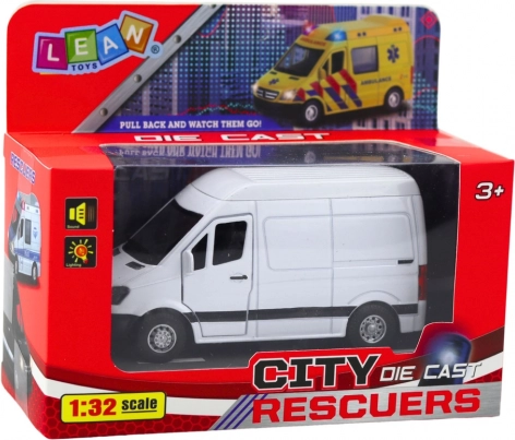 Realistico furgone in metallo in scala 1:32 che entusiasmerà grandi e piccini. Offre motore a retrocarica (pull back), porte apribili e effetti luminosi e sonori. La combinazione di metallo e plastica di alta qualità garantisce resistenza; il design bianco minimalista si adatta a qualsiasi collezione di modellini.