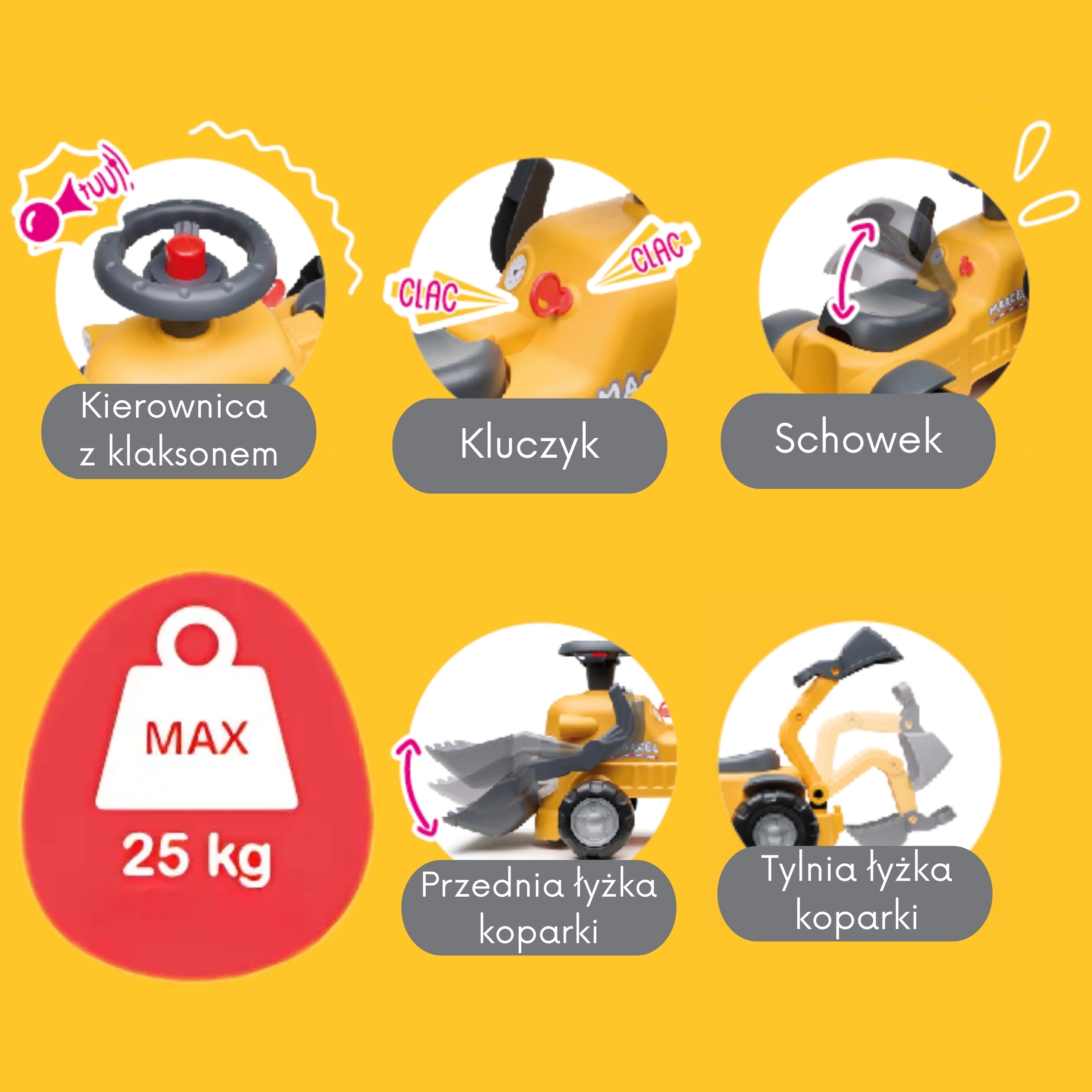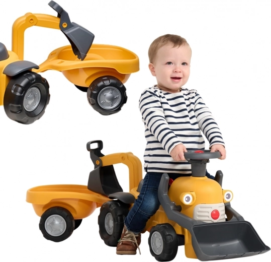 Scopri il primo monopattino-spinta compatto con vere funzioni da escavatore, che unisce movimento e gioco di ruolo. I bambini si divertiranno a raccogliere e svuotare piccoli oggetti grazie alla benna anteriore, mentre la benna posteriore è perfetta per caricare il rimorchio rimovibile. Il volante girevole con clacson, la chiave a scatto e il vano sotto il sedile garantiscono ore di divertimento creativo.