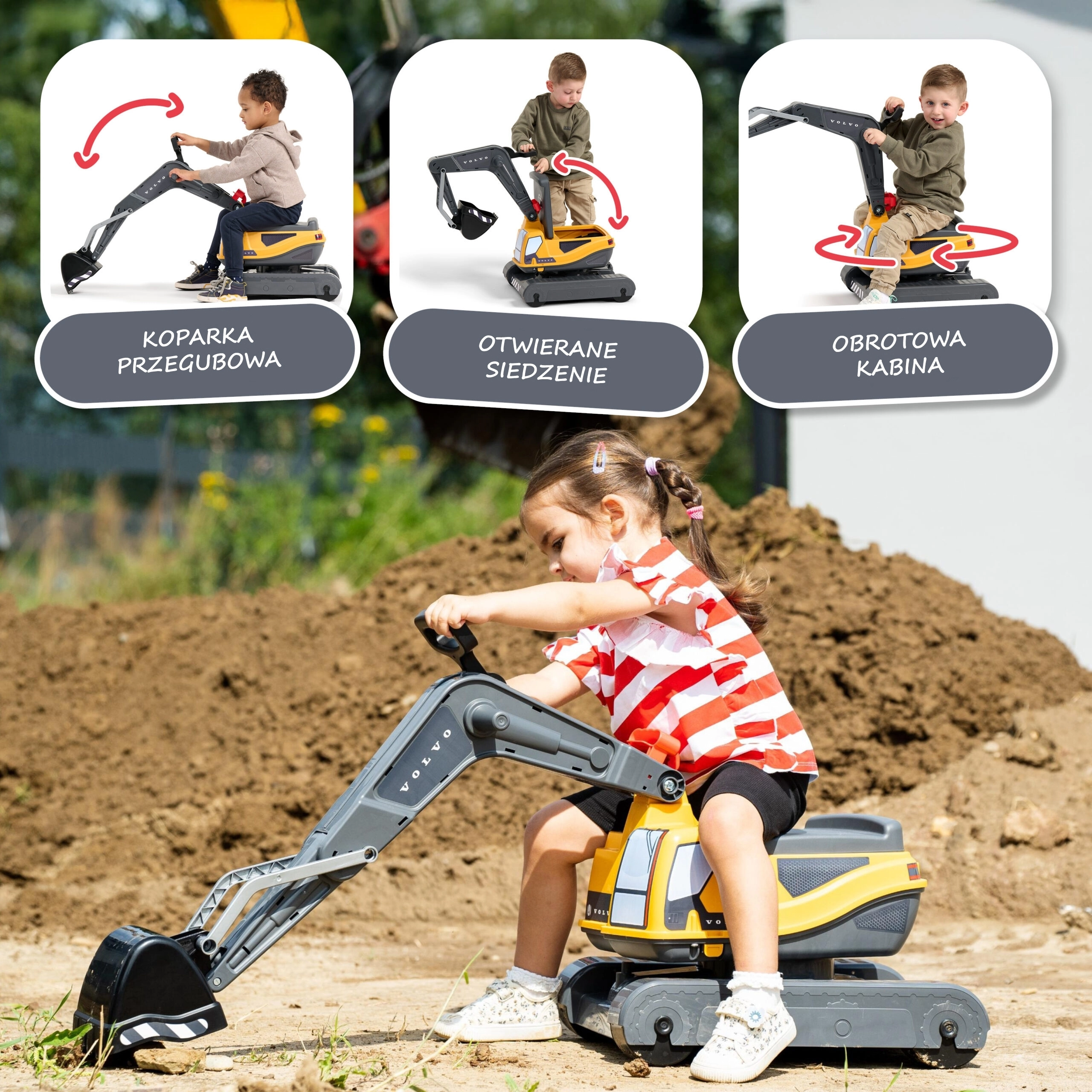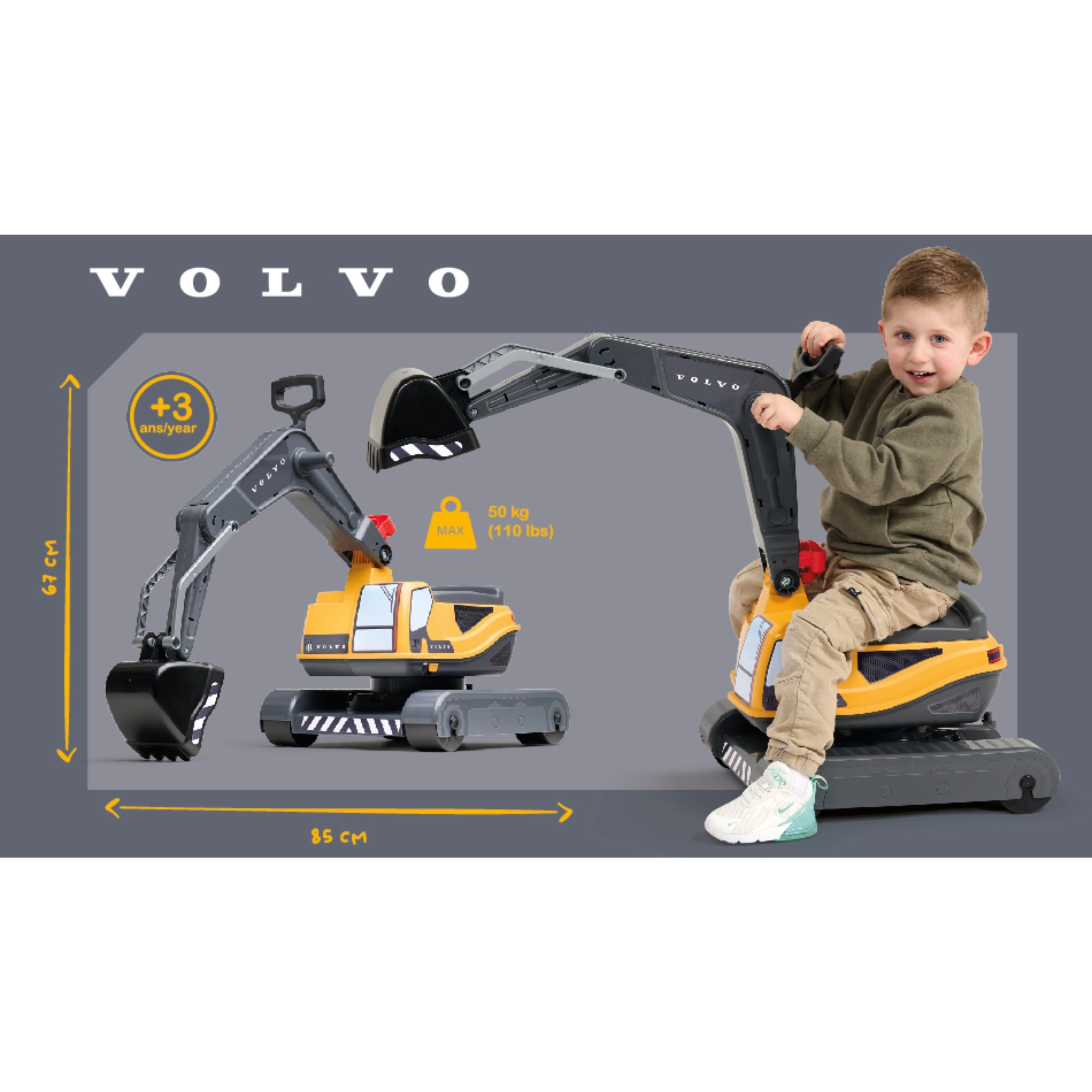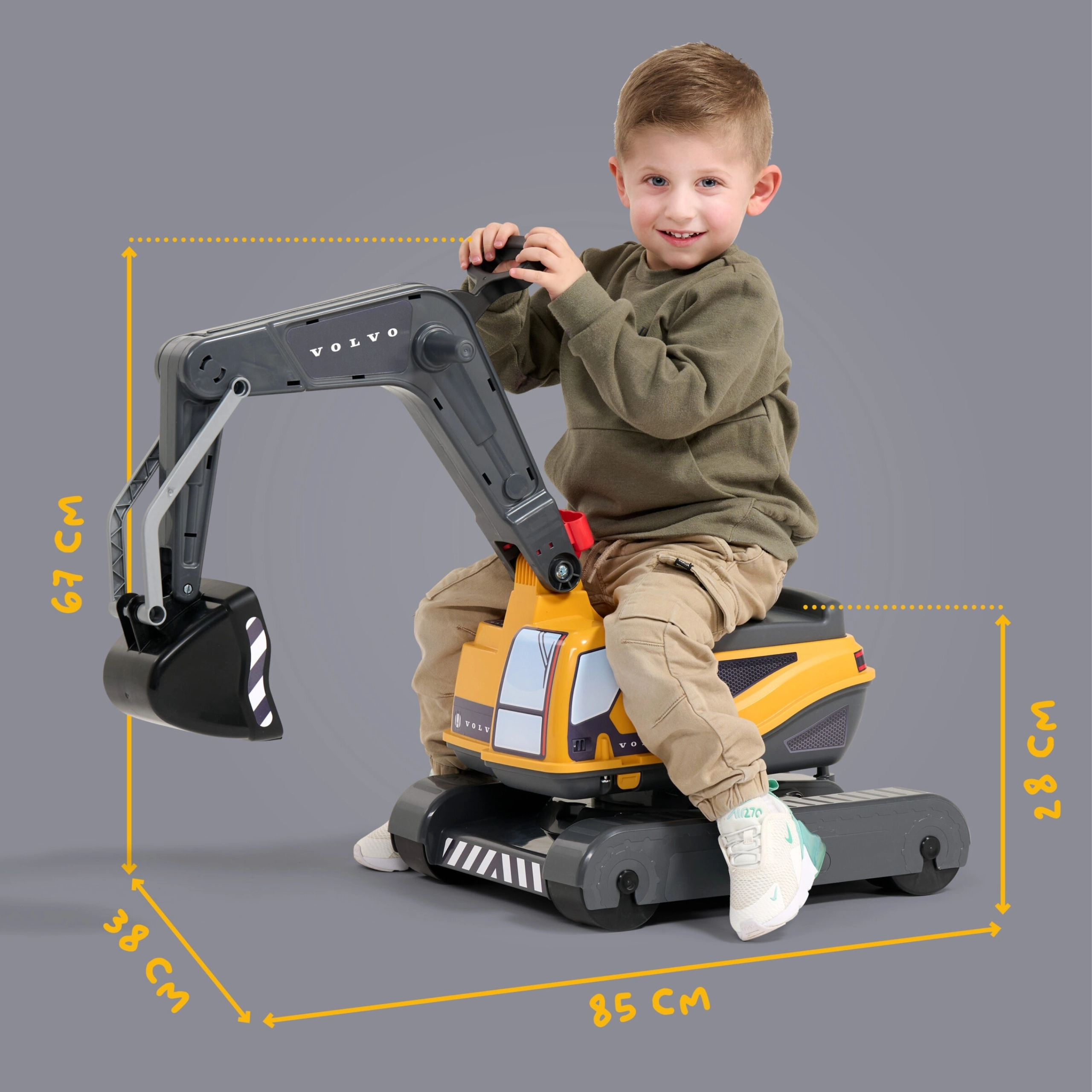 Questa scavatrice gommata per bambini VOLVO riproduce fedelmente il mezzo reale e offre una struttura robusta per un divertimento sicuro e duraturo. La cabina ruota di 360°, così il bambino può scavare e scaricare il materiale senza spostare il veicolo. Il sedile apribile nasconde un comodo vano portaoggetti per piccoli oggetti.