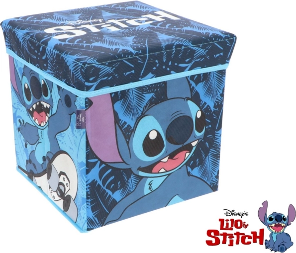 Pratico box portaoggetti pieghevole con coperchio e motivo STITCH, che funge anche da comodo pouf. Grazie alla struttura robusta e alla portata del coperchio di 80 kg è ideale per la cameretta, la sala giochi e il bagno. Offre un volume di 27 l, si ripiega facilmente in formato piatto e aiuta a mantenere l’ordine tra giocattoli e libri.