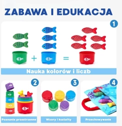 - Apprendimento attraverso il gioco: ordinare i pesciolini nei bicchierini numerati sviluppa il conteggio e il riconoscimento dei colori.