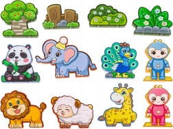 - Pezzi magnetici di varie forme, figurine di animali, figurine personaggi, accessori tematici (albero, rocce), istruzioni
