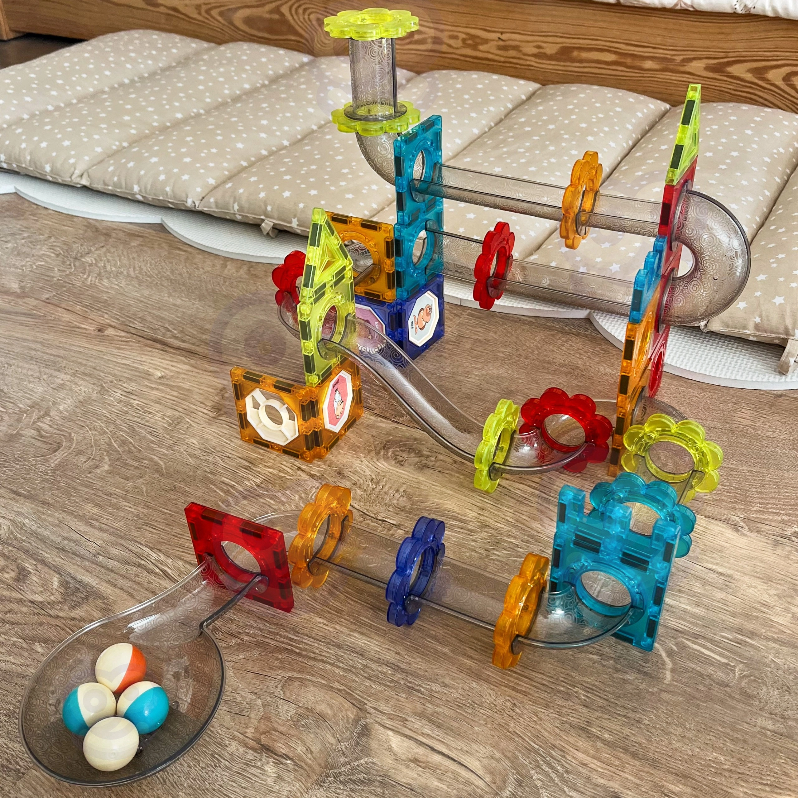 Il set WOOPIE combina tessere magnetiche con elementi trasparenti della pista a biglie, così i bambini possono progettare e costruire varianti infinite di tracciati. Grazie ai collegamenti solidi e ai materiali di qualità, le strutture restano stabili mentre le biglie scorrono senza intoppi attraverso rampe, curve, imbuti e tunnel. L’apprendimento dei principi fisici si fonde naturalmente con il gioco.