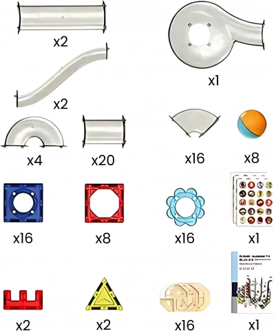 - Pezzi magnetici di varie forme e colori; parti trasparenti della pista (canaline, curve, imbuti, tunnel); biglie colorate; adesivi decorativi; manuale illustrato