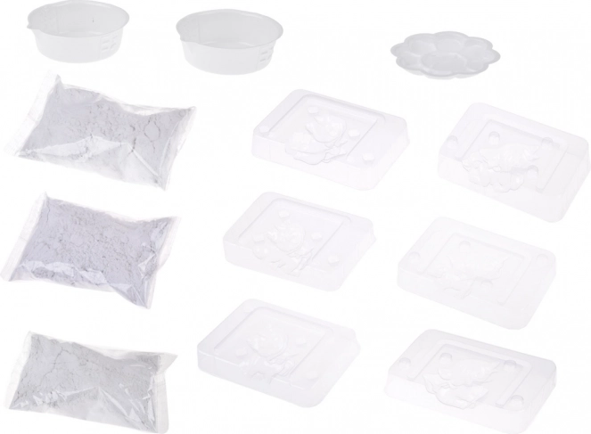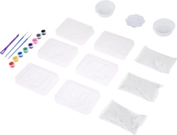 Contenuto della confezione: 3 sacchetti di gesso, 3 stampi per unicorni, 2 misurini, 1 tavolozza/ciotolina per miscelare i colori, 8 colori, 2 pennelli, 1 coltellino in plastica. Consiglio: per una superficie colata liscia, mescola il gesso fino a completo scioglimento e batti delicatamente lo stampo per far uscire le bolle d’aria.