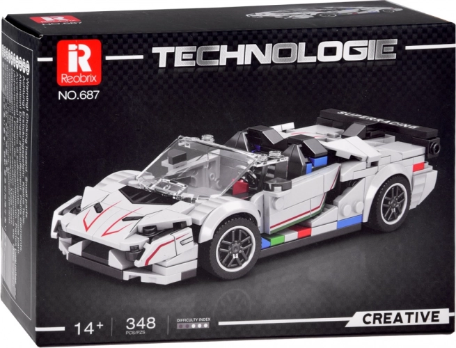 Set di costruzione tecnico cabrio supersportivo bianco con spoiler. 348 pezzi, look sportivo, adesivi, difficoltà media. Ideale per età 14+.