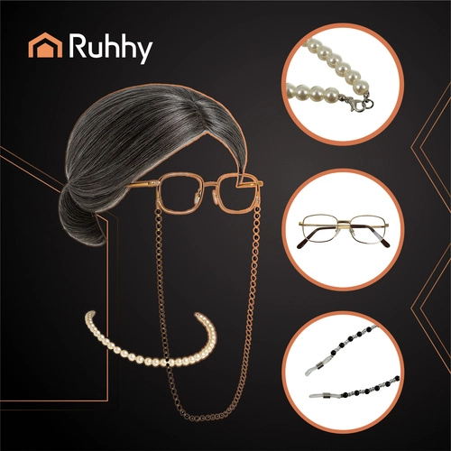 Il divertente costume da nonna RUHHY ti regala una trasformazione rétro istantanea. Il set include una parrucca grigia raccolta a chignon, una cuffia, occhiali con catenella e una collana di perle. Grazie alla taglia universale e al peso ridotto è comodo da indossare ed è ideale per Halloween, carnevali e feste a tema.