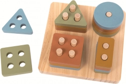 Questo gioco di impilamento in legno di alta qualità offre quattro forme di base – quadrato, triangolo, cerchio e rettangolo – in colori piacevoli. Ogni forma ha un numero diverso di fori, aiutando i bambini a comprendere il principio di classificazione e del ragionamento logico. Durante l’inserimento dei pezzi sui pioli, i bambini allenano naturalmente la presa, la precisione del movimento e la concentrazione.