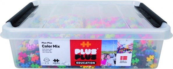 PLUS-PLUS box mix 3600 pezzi in colori classici, neon e pastello. Qualità danese, plastica riciclata, brochure con istruzioni. Ideale per gruppi, 5+.