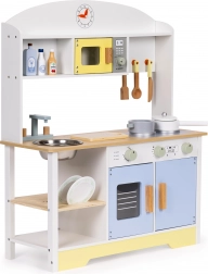Scopri la gioia di cucinare con la cucina ECOTOYS, progettata nei dettagli per i piccoli chef. Elementi realistici come due piastre con manopole girevoli, forno e microonde con sportelli apribili e lavello con rubinetto coinvolgono i bambini in un mondo di fantasia e insegnano le basi della preparazione dei pasti e dell'ordine in cucina.