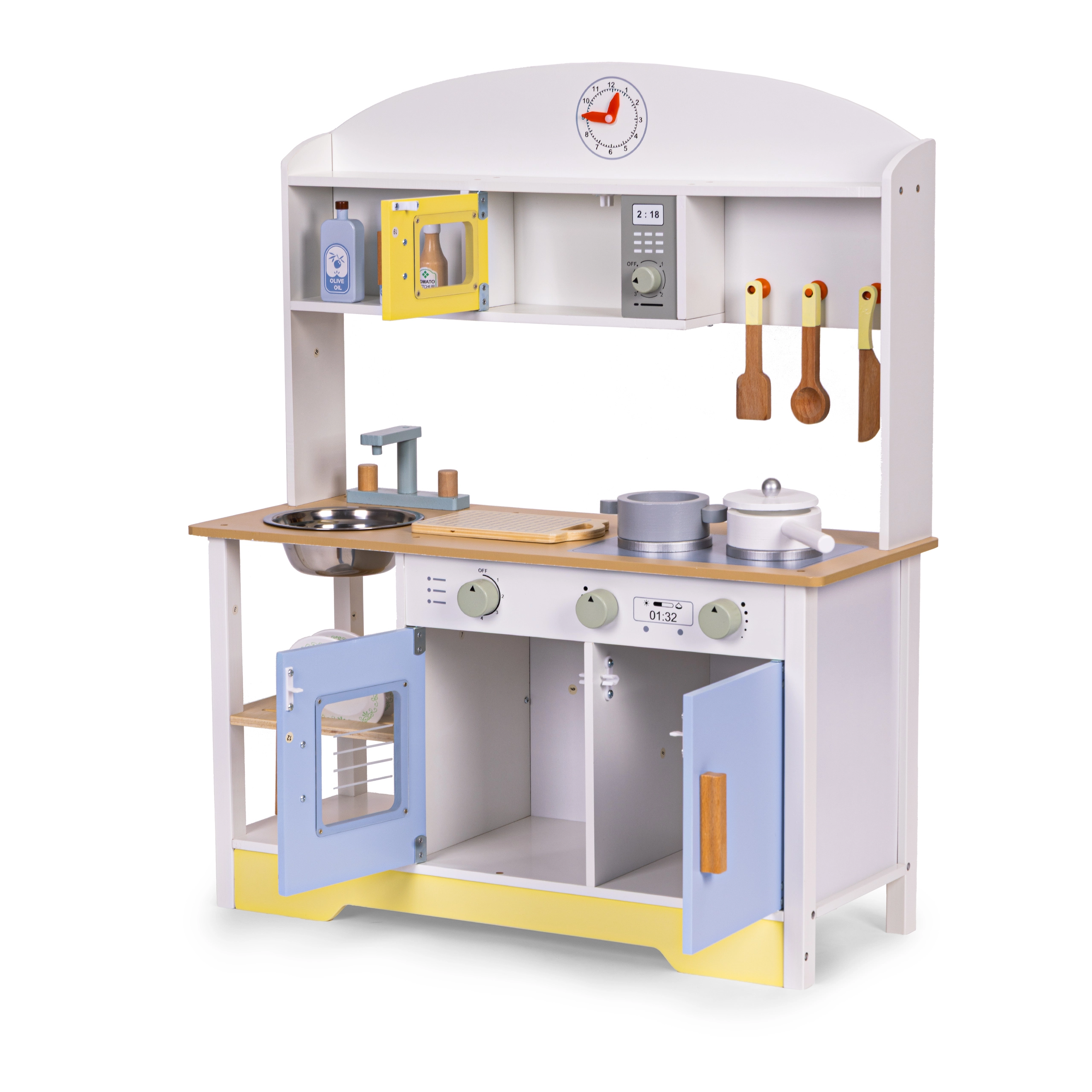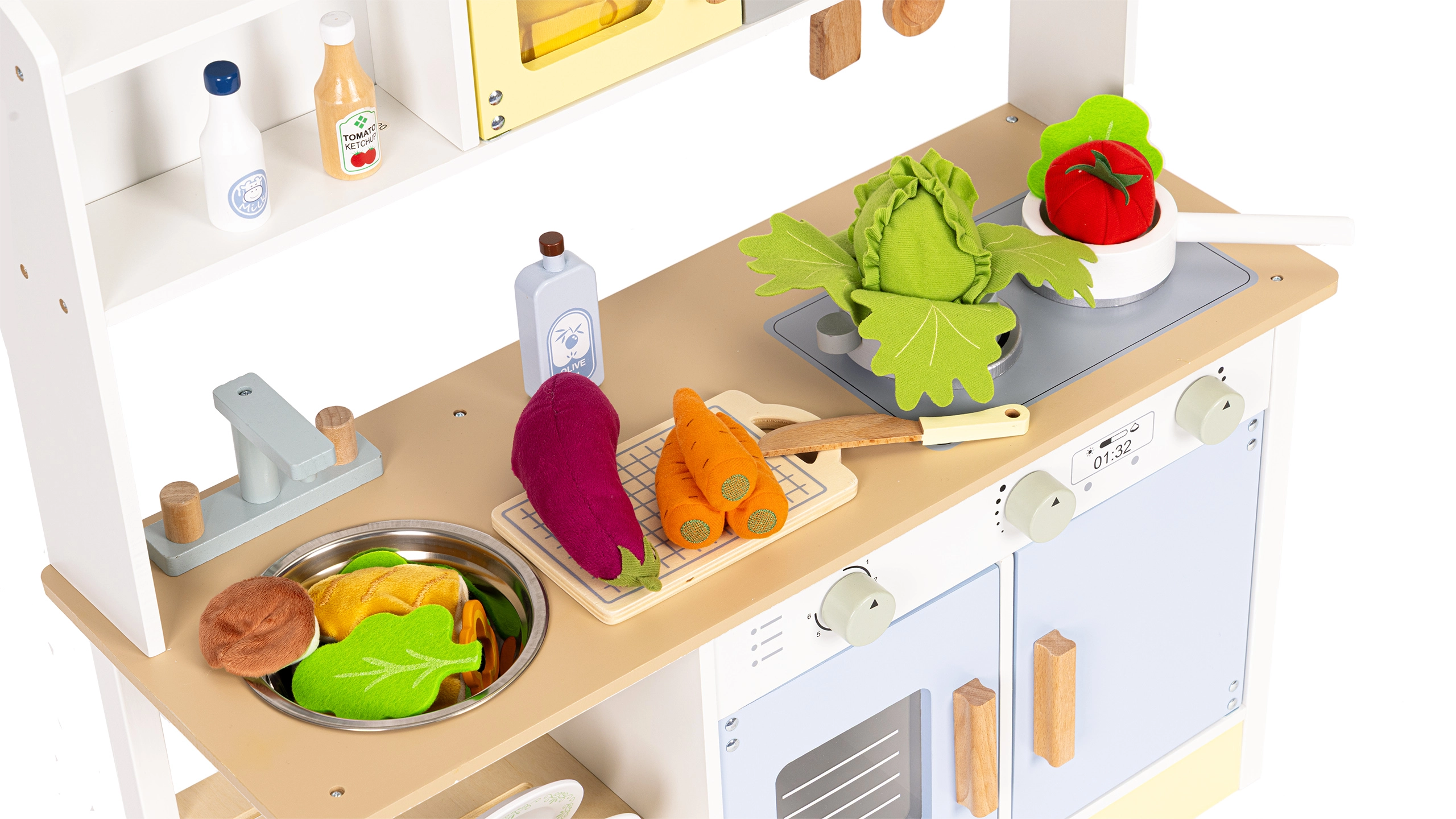 Grazie alla lavatrice con selettore girevole, ai pratici armadietti e ripiani e all'orologio con lancette mobili, la cucina sviluppa la motricità fine, la percezione del tempo e il senso di responsabilità. Inclusi 12 accessori in legno – pentola, padella con coperchio, piattini, posate, tagliere e bottigliette “olio d'oliva”, “ketchup” e “latte” – per iniziare a giocare subito.