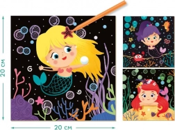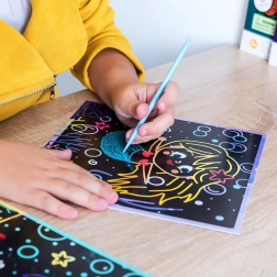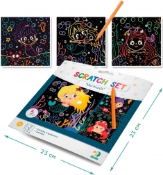 Nella confezione trovi tre cartoncini quadrati da 20 × 20 cm e una pratica penna per grattare. I bambini possono seguire le linee suggerite oppure dare libero sfogo alla fantasia e creare un originale mondo sottomarino.