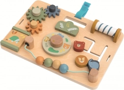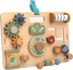 Questa activity board in legno a tema Safari offre ai bambini dai 18 mesi numerosi stimoli per il gioco e l’apprendimento. I colori tenui e le simpatiche illustrazioni degli animali favoriscono la percezione sensoriale, mentre i vari elementi meccanici insegnano a ruotare, far scorrere, aprire e chiudere – abilità utili per le attività quotidiane.