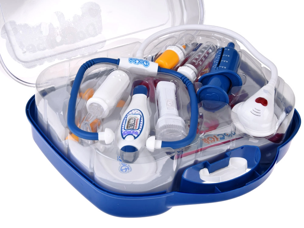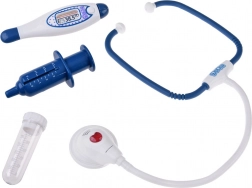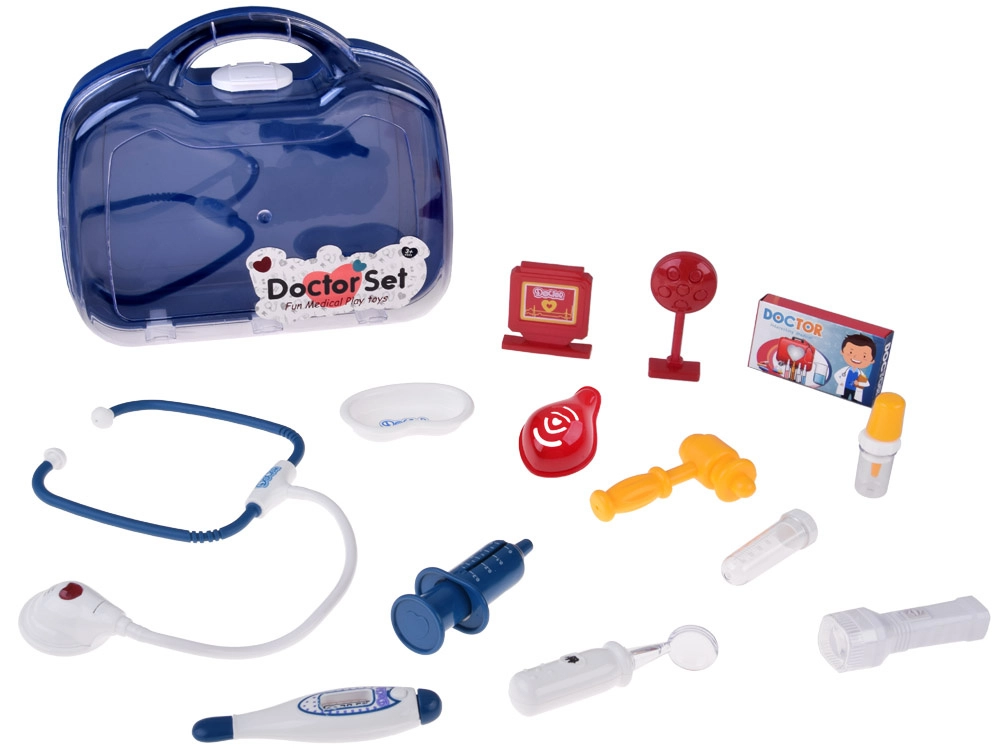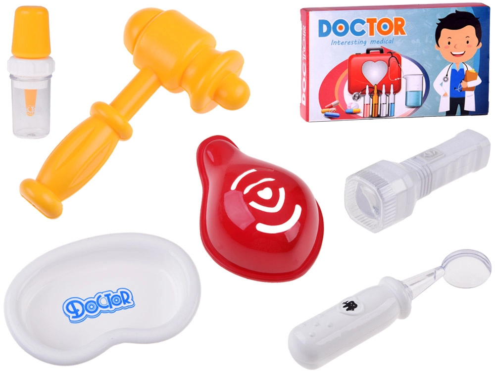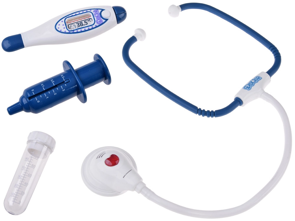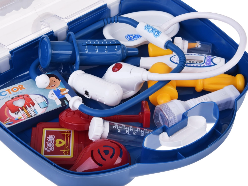 - Stetoscopio (con suono), torcia luminosa, termometro digitale (con indicatore girevole), siringa con pistone mobile, martelletto riflessi, otoscopio/torcia, specchietto laringologico, provette e pipetta, bacinella “a rene”, tessera DOCTOR, scatolina “medicine”, altri piccoli accessori