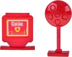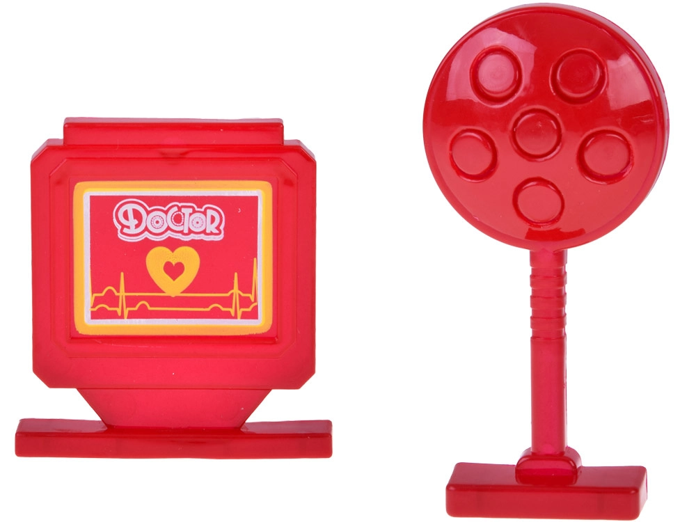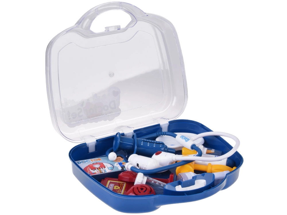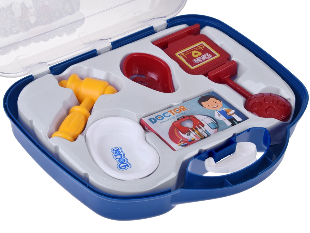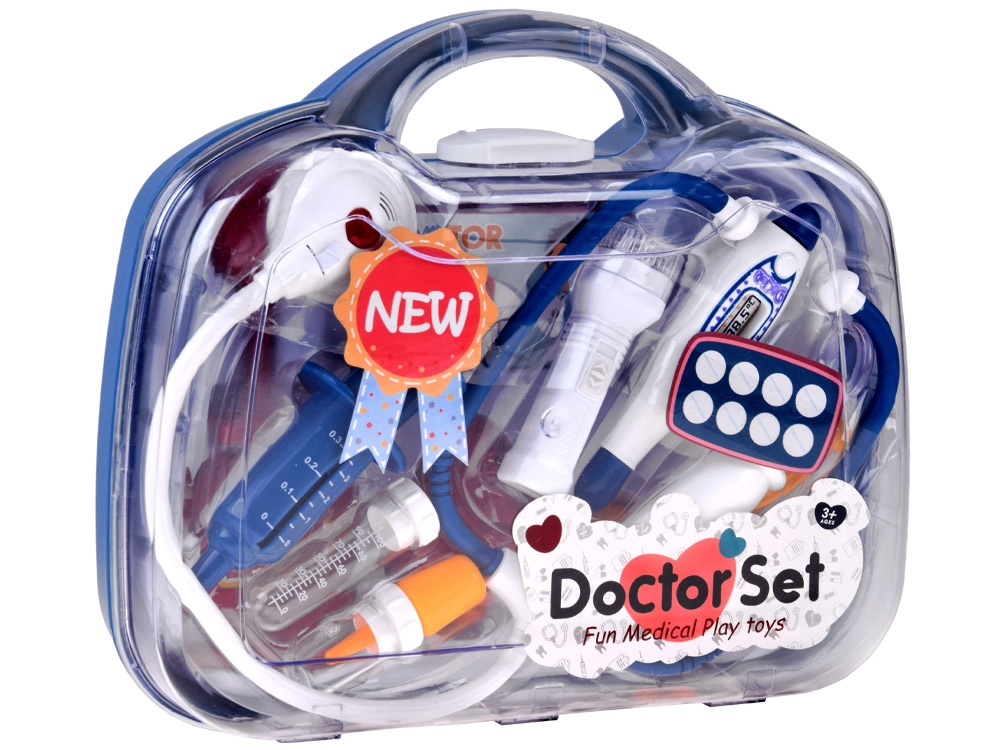- Stetoscopio (con suono), torcia luminosa, termometro digitale (con indicatore girevole), siringa con pistone mobile, martelletto riflessi, otoscopio/torcia, specchietto laringologico, provette e pipetta, bacinella “a rene”, tessera DOCTOR, scatolina “medicine”, altri piccoli accessori