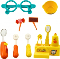 testa del cagnolino con 8 denti, spazzolino da denti, trapano, pinzette, ciotola/“bacinella”, mortaio, boccette con medicine, tubetto con dentifricio a scorrimento, segnalini (cioccolato, caramella), supporto per accessori, specchietto illuminato, occhiali