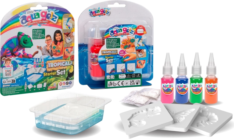 Il set iniziale Tropicalz è un regalo ideale per i piccoli creatori. Offre un procedimento semplice, colori vivaci e un’apposita vaschetta riutilizzabile per la soluzione acquosa. La creazione a casa è sicura se si seguono le istruzioni; è consigliata la supervisione di un adulto.