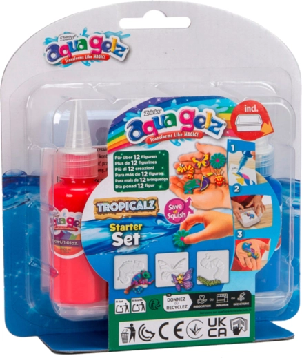 Set creativo AQUA GELZ TROPICALZ trasforma in pochi secondi i gel colorati in morbide figurine 3D dal mondo tropicale. Basta preparare la soluzione magica a base d’acqua, riempire gli stampini con gel colorati e immergere: le figurine finite risaliranno da sole in superficie, pronte per un’infinita creatività e divertimento per bambini dai 5 anni in su.