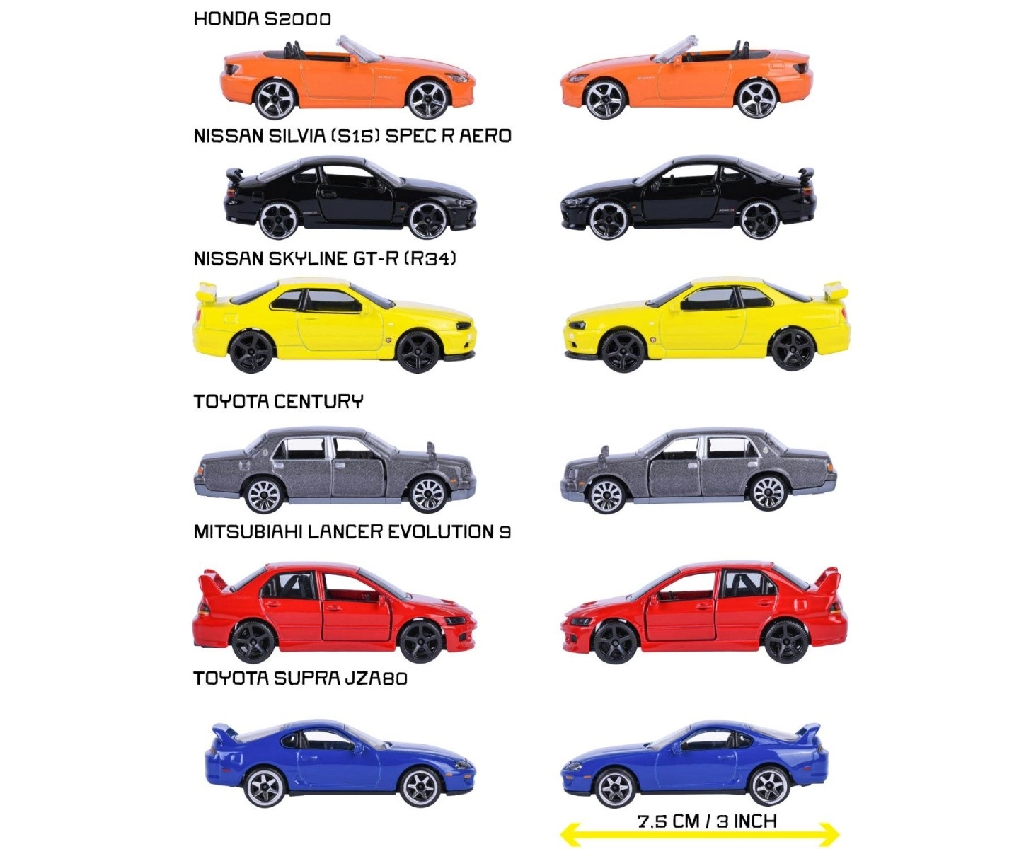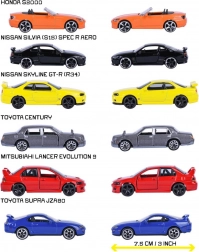 Grazie alle parti apribili (ad es. porte, cofano o bagagliaio) e alle ruote libere, le automobiline sono perfette sia per giocare sia per l’esposizione da collezione. La confezione può includere uno dei modelli preferiti dei marchi NISSAN, MITSUBISHI, TOYOTA o HONDA nella serie Japan in edizione limitata.
