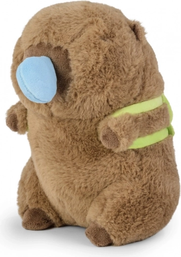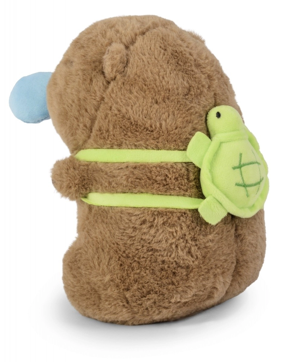 La capibara porta sulla schiena un morbido “tartarughino” verde che dona al giocattolo un carattere unico e stimola storie piene di fantasia.