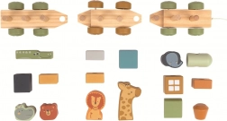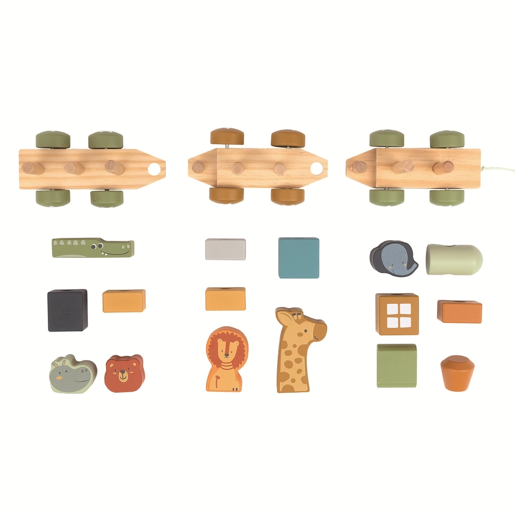 Questo trenino di legno con locomotiva e due vagoni offre ai bambini tanto divertimento e apprendimento. Sui pioli dei carrelli i bambini infilano i pezzi colorati e costruiscono il proprio trenino, mentre i simpatici animaletti – giraffa, elefante, orso, leone, ippopotamo e coccodrillo – partono per una gita. Il giocattolo favorisce lo sviluppo delle abilità motorie, della pazienza e della concentrazione.