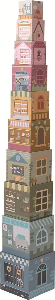 Questo incantevole set di costruzioni in legno dai delicati colori pastello trasforma ogni gioco in un'avventura. Ognuno dei 10 blocchi rappresenta un'edificio tematico della città – scuola, ospedale, libreria, fioraio, supermercato e altri. I bambini possono creare alte torri e strade variegate allenando al contempo la coordinazione occhio–mano e la percezione spaziale.
