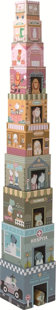 Scopri il mondo creativo della cittadina con la torre impilabile City in legno. Il set include 10 blocchi di diverse dimensioni e 8 figure di animaletti che rappresentano professioni. I bambini possono impilare i blocchi in alto come un grattacielo oppure disporli affiancati come una città. Sostiene la motricità fine, il pensiero logico, la creatività e l'apprendimento di colori e forme. 6 blocchi con finestrelle offrono spazio per nascondere le figurine e infinite possibilità di gioco a casa e in viaggio.