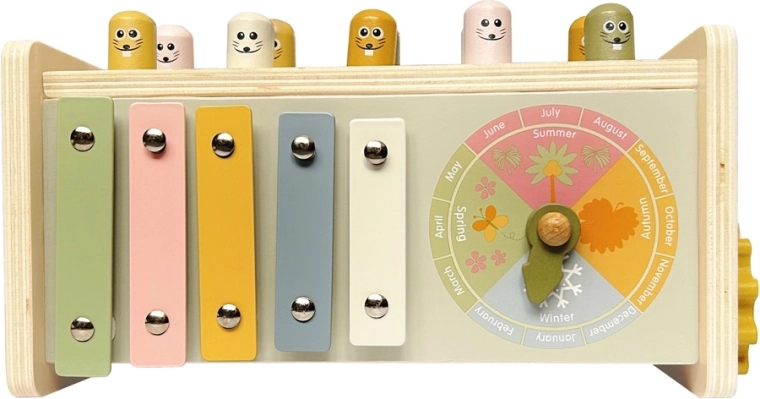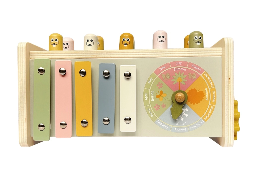 Personaggi allegri e un martelletto in legno motivano i bambini a esercitare coordinazione, forza del colpo e ritmo. La struttura resistente sopporta il gioco quotidiano.