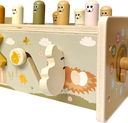 Questo ricco giocattolo multifunzionale in legno conquista i bambini con tante possibilità di gioco e, allo stesso tempo, li guida in modo naturale allo sviluppo di importanti abilità. I bambini possono colpire le simpatiche talpe con il martelletto in legno, pescare i pesciolini magnetici, far ruotare gli ingranaggi, provare le lancette dell’orologio e scoprire altri elementi meccanici che favoriscono la comprensione di causa ed effetto.