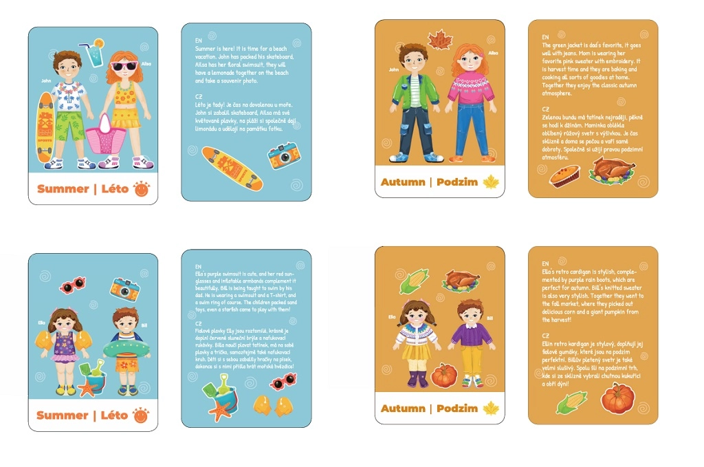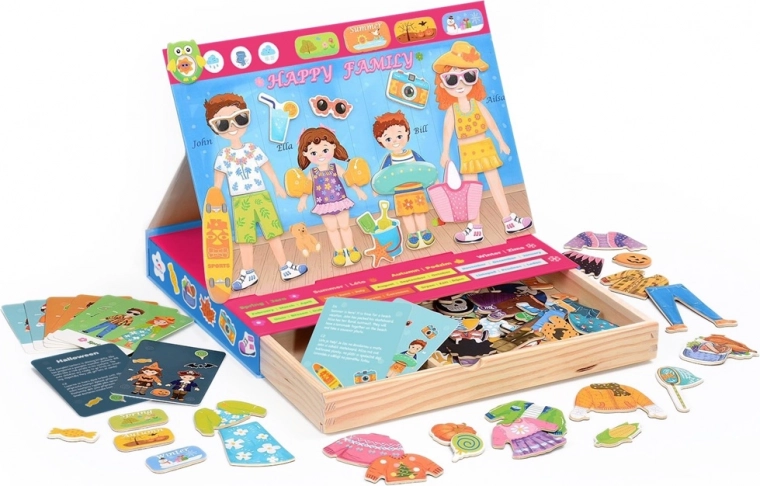 Il set Vestirsi Magnetico Famiglia è un gioco creativo in cui i bambini creano abiti per mamma, papà, figlia e figlio. Grazie all’ampia scelta di vestiti e accessori possono comporre outfit per estate, autunno, inverno e primavera, e completare divertenti attività con i cartoncini tematici. La pratica scatola magnetica in legno con lavagna girevole funge da superficie di gioco e contenitore, così il gioco è sempre pronto a partire con voi.